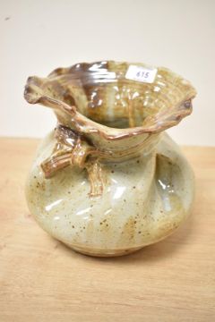 A 20th century studio pottery stoneware vase, formed as a loosely tied sack with mottled buff glaze, indistinct incised signature to body and painted to base 18cm small chip to rim.