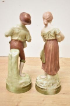 A pair of Royal Dux porcelain water carrier figures comprising model numbers 2221 and 2223, both having pink triangle stamps to base, measuring 22cm tall respectively.