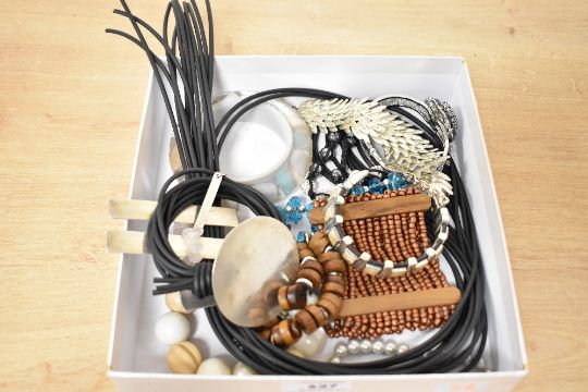 A collection of costume jewellery, including contemporary pieces by L_nk by Natali, wooden pieces and a rose quartz chip bracelet