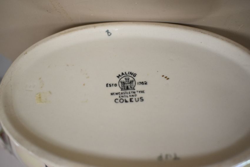 Three items of Maling lustre ware in the 'Coleus' pattern to include a pedestal vase, jug and a tulip shaped vase sold along with a hand painted Sylvac vase having asymmetric handles and floral design and another similar lustre ware vase.