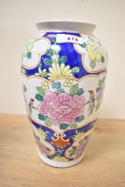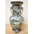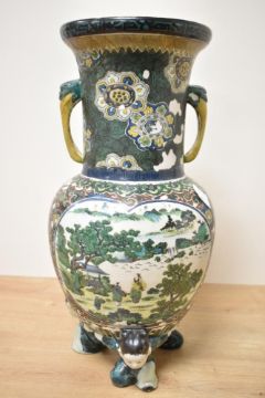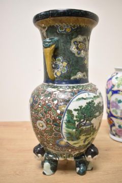 Two decorative 19th to 20th century Chinese porcelain vases, to include a famille verte-style vase with twin handles of snake-like form, featuring a detailed hand-painted landscape scene and one of a family of chickens, base supported by three figures in traditional dress, reign mark to base; sold with a Wucai-style vase featuring colourful birds and floral motifs, unmarked. Considerable damage to famille verte-style vase including a large fixed but noticeable chip to lip, overall surface enamel wear, areas where paint has come off completely, most noticeable around neck, middle section, and figures at base.
