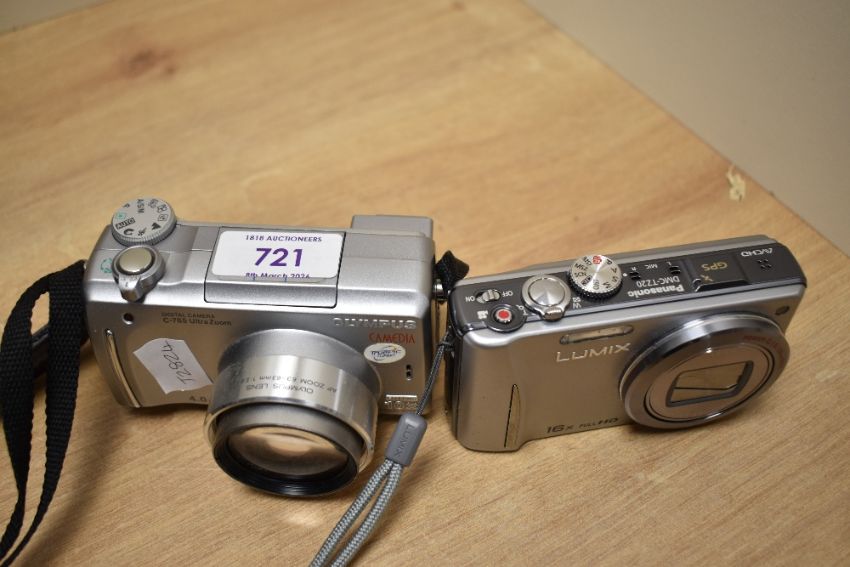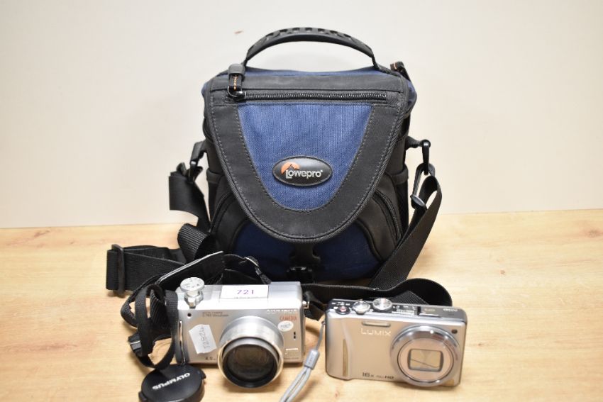 Two digital cameras. An Olympic Camedia C-765 and a Lumix Panasonic DMC-TZ20 in soft camera bag with cables and booklets