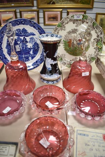 A small collection of cranberry glass including two large bells (one missing the handle finial) and four frilled bowls sold along with an Oriental inspired porcelain vase decorated with a blue and white crane motif on a dark bue ground etc.