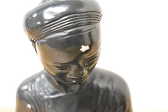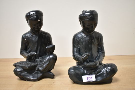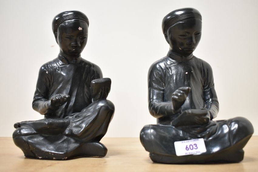 Two mid 20th-century black chalkware Austin Productions figures, The Scholar and The Scribe, featuring stylised seated male forms, marked and dated 1961 to base, 23cm, visible chipping to the head of one figure, light surface wear to both consistent with age and material.