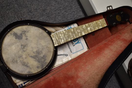 An early to mid 20th Century John Grey & Sons banjo ukulele , having pearlescent neck and metal resonator, sold with vintage carry case