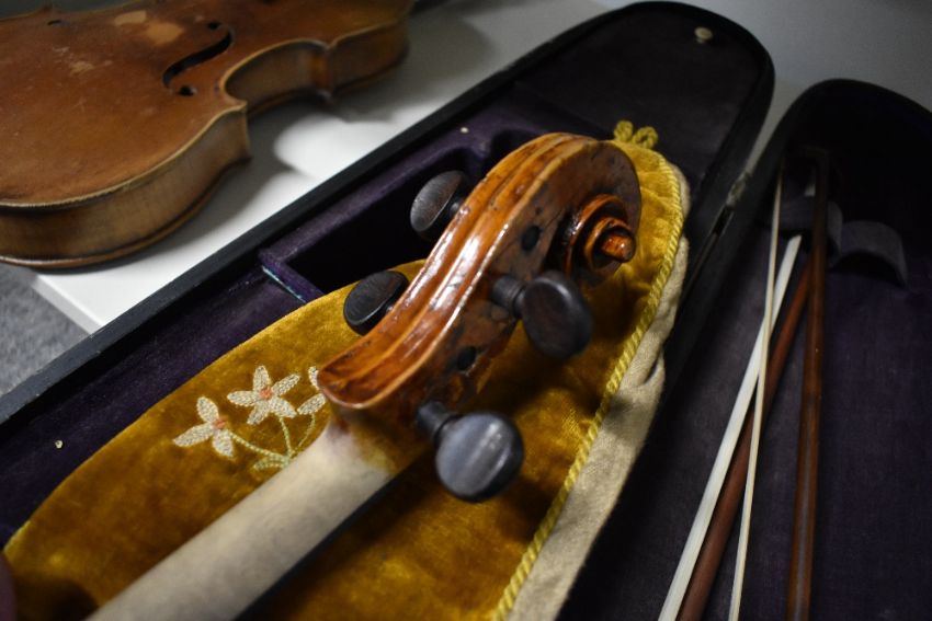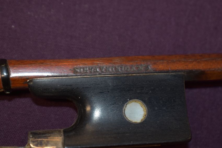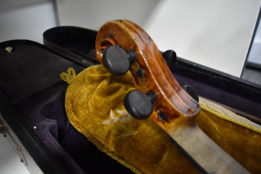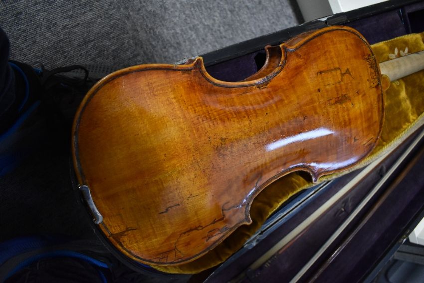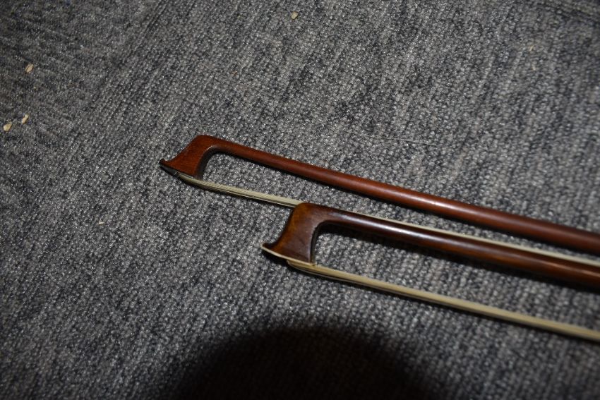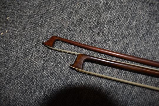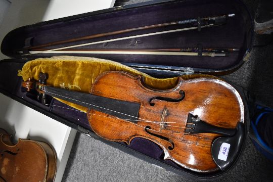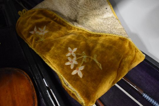 A traditional violin, unlabelled probably 19th Century , having two piece 14 inch back, in nice quality 19th Century case with line inlay decoration, and two bows