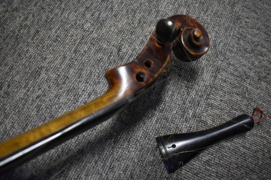 A traditional violin, having two piece back , approx. 14', interior label Stradivarius Cremona, dated 1736 but most likely a late 19th or early 20th Century copy, sold with two bows and hard case