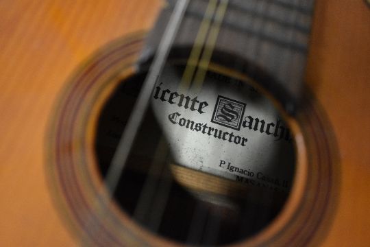 A traditional Spanish flat back pear shaped mandolin (8 string) , labelled internally Vicente Sanchis