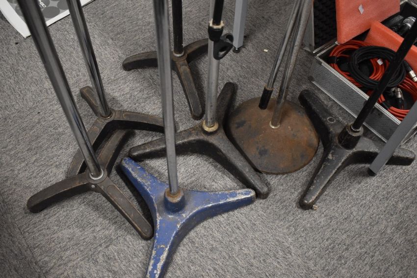 A selection of vintage mic stands having solid bases and telescopic action