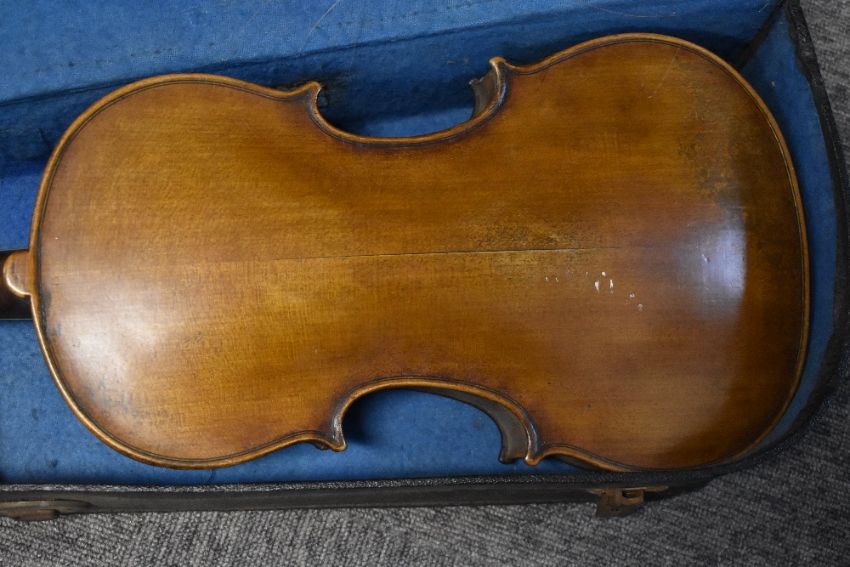 A traditional violin, probably early 20th century, having two piece back , approx. 14', interior label Stradivarius (copy) Cremona, sold with two bows and semi hard case