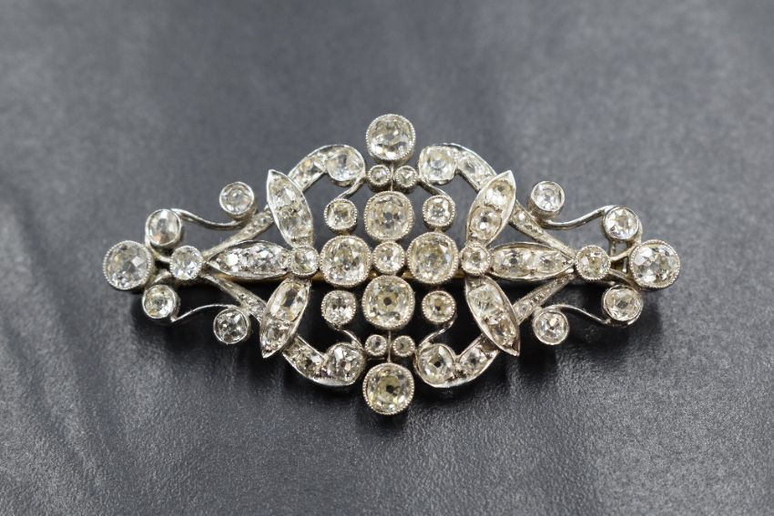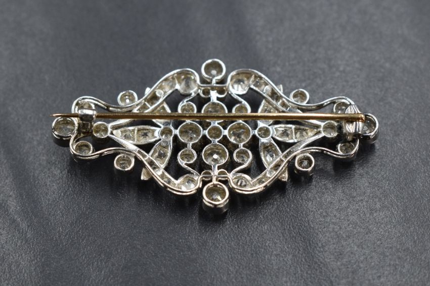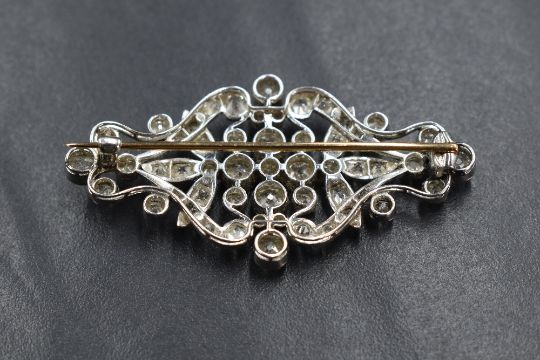 An early 20th century white metal diamond set brooch, the bezel set old cushion, round and baguette cut diamonds in an ornate pierced floral scroll design, with a yellow metal pin, 5.5cm x 3cm, 13.7g