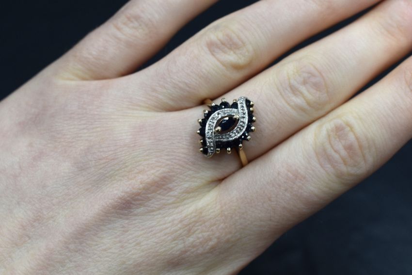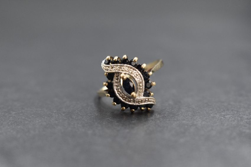 A 9ct gold diamond and sapphire ring having a small central marquise cut sapphire within a swirl band of pave set diamond chips with an outer surround of small sapphire stones in a raised mount on a 9ct gold loop, size Q & 2.8g
