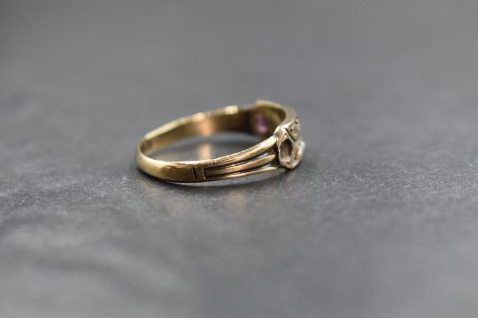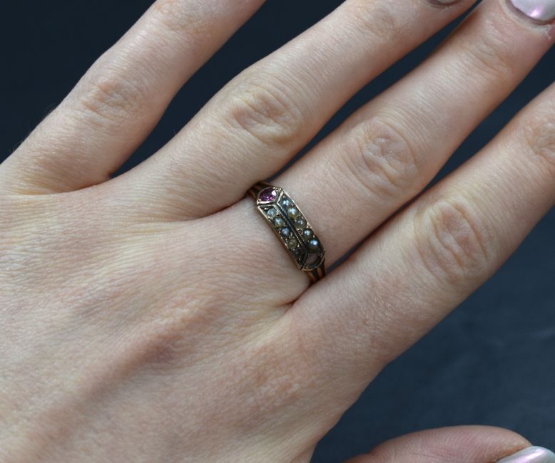 A Victorian 9ct gold band ring having seed pearl and spinel decoration, several stones missing, approx 1.6g