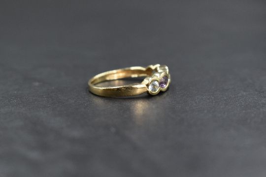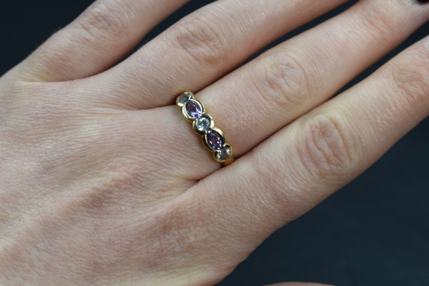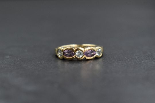 A 9ct gold amethyst and topaz set band, the three round cut pale blue topaz alternating with two marquise cut amethyst, in bezel settings, marked 375, ring size M, 2.3g