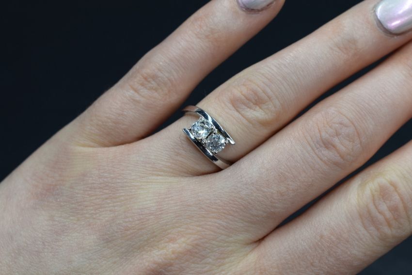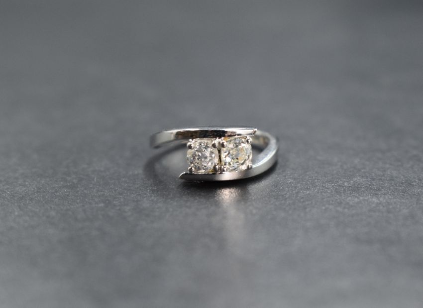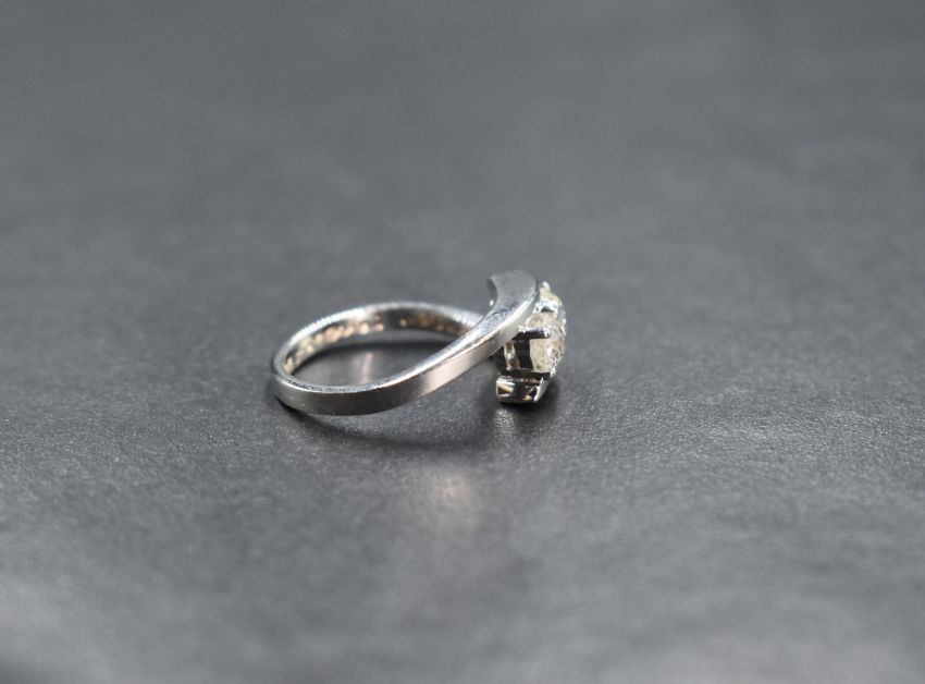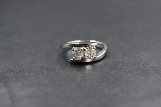 An 18ct white gold diamond set cross over ring, the two old cut diamonds measuring approximately 0.33ct each, in four claw settings within a modern cross over motif ring, having personalised engraving to the inner band, marked 750, ring size J-K, 4.6g