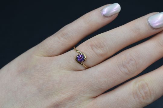 A 9ct gold amethyst set ring, the round cut amethyst in a cross over setting, marked 375, ring size I-J, 1.3g