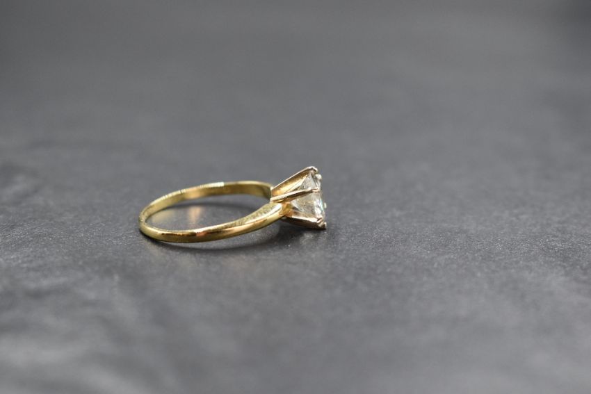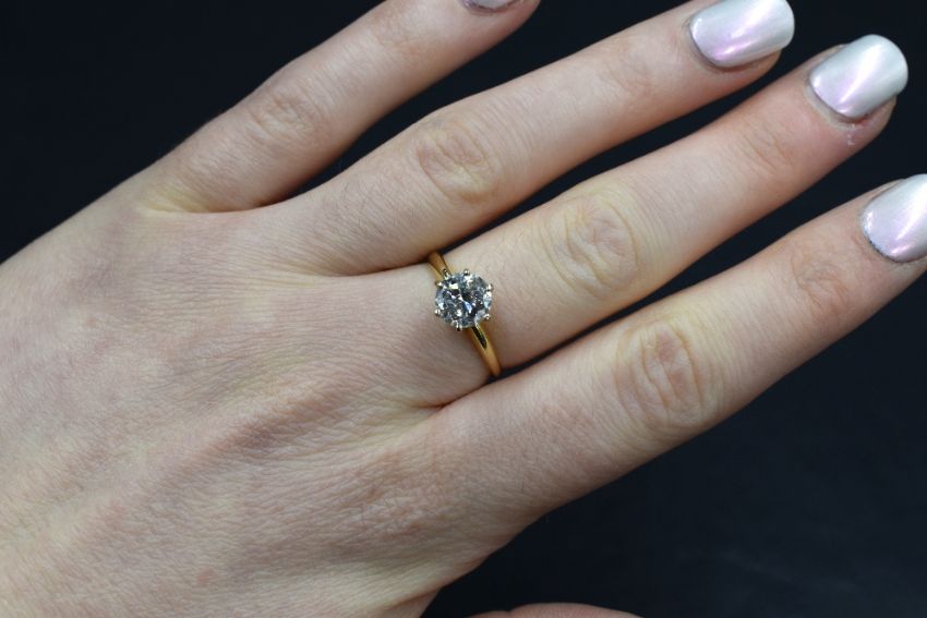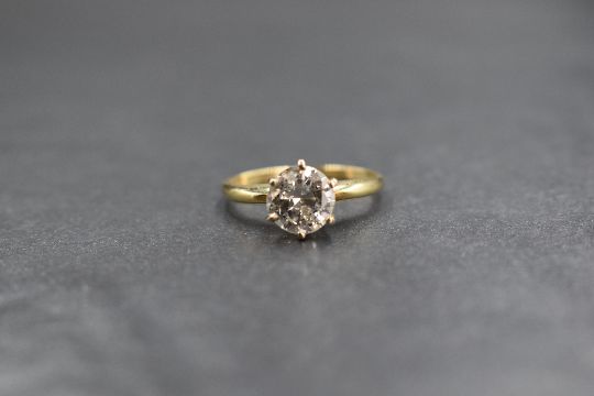 An 18ct gold diamond solitaire ring, the diamond being approx 1.28ct in a raised six claw set mount on a fine yellow metal loop stmped 18ct, some marks worn, size M & approx 2.3g, some carbon visible in stone to naked eye