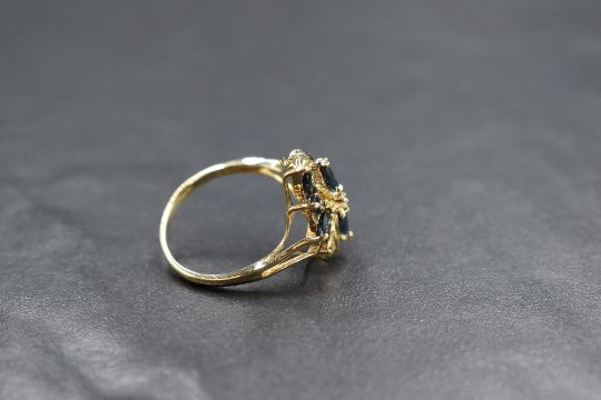 A 9ct gold sapphire ring having nine marquise cut sapphires in a floral design surrounding a small central diamond within an open claw set mount to split shoulders on a 9ct gold loop, size P & 2.7g
