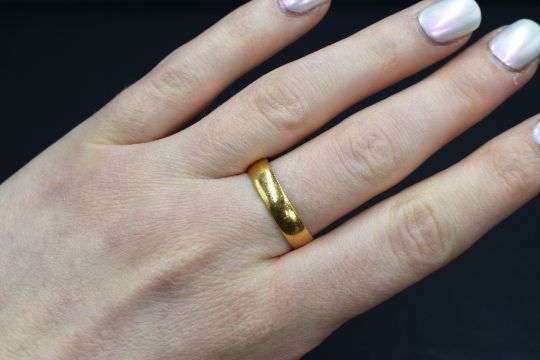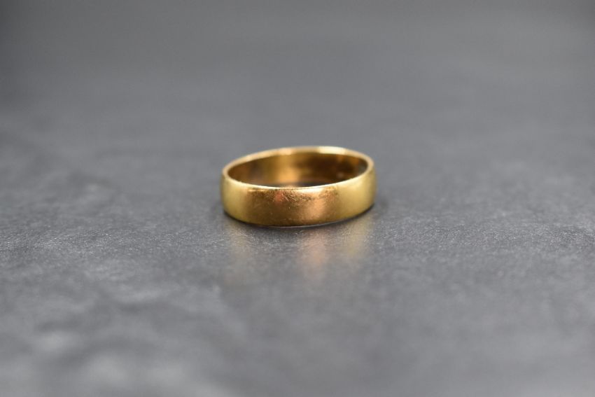 A 22ct gold band, of plain form, marked 22 with hallmarks, ring size P, 4.5g