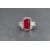 An 18ct white gold ruby and diamond set cluster ring, the central emerald cut ruby measuring approximately 11mm x 6mm x 3mm in an eighteen round brilliant cut diamond surround, having six baguette cut diamonds and ten round brilliant cut diamonds to each squared shoulder, marked 750, ring size M, 6.5g. Ruby loose in setting with various inclusions