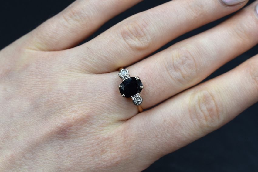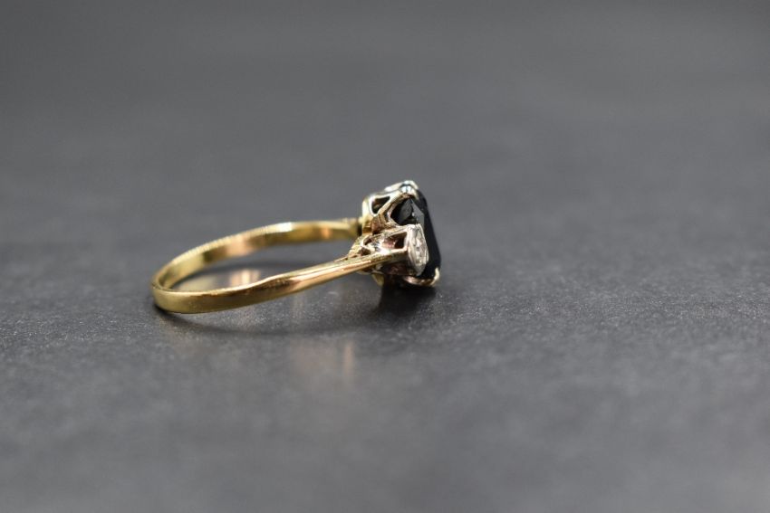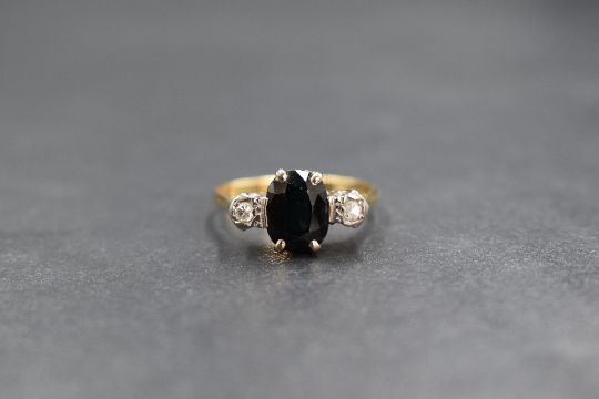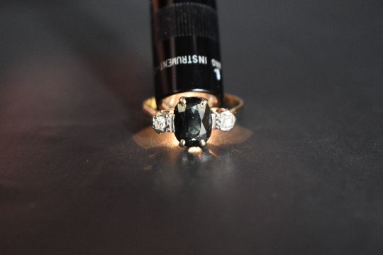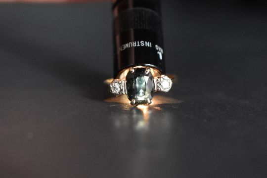 An 18ct gold sapphire and diamond set trilogy ring, the central oval cut sapphire measuring approximately 1ct, having a blue-green colour under direct light, flanked by an illusion set diamond to each side, marked 18 with hallmarks, ring size O, 3.2g