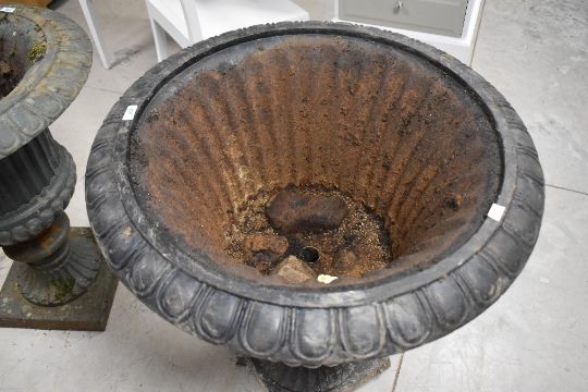 A larger black-painted cast-iron Campana style garden urn, of typical form with everted egg-and-dart rim over the fluted body and gadrooned base, raised on a spreading fluted circular foot and square socle, 79cm x 72cm