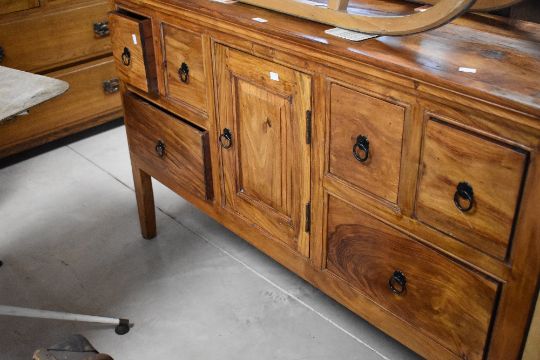 A modern imported hardwood multi drawer sideboard, the rectangular top above an arrangement of six drawers around a central fielded panel cupboard door, raised on tapering square section legs, 93cm x 145cm x 41cm