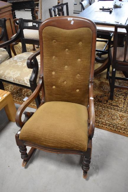 A Victorian mahogany scroll-arm rocking chair, with buttoned and padded back over the serpentine fronted padded seat and scrolled open armx raised on turned front supports and shaped rockers, seat height 42cm, 96cm overall