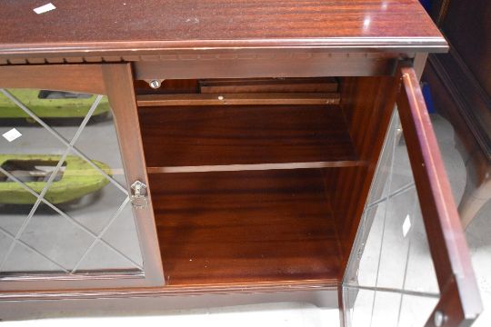 A late 20th Century mahogany effect lounge unit comprising shelves over faux leaded glass lower display, width approx. 85cm, sold with reproduction mahogany corner display having astraglazed upper section over cupboard, height approx. 181cm