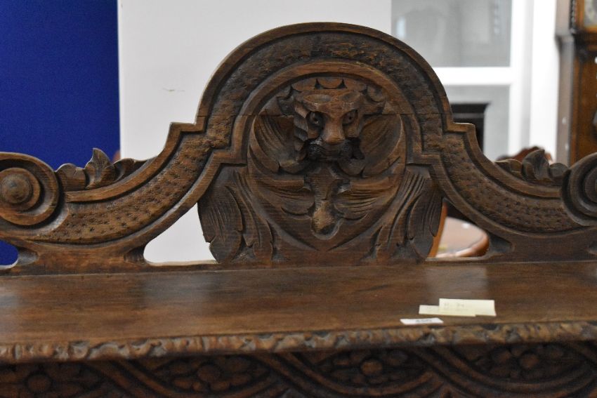 A Victorian carved oak hall bench, having a shaped and pierced back carved with central mask and scrolls, between turned arms and over the oblong seat with carved edge detail, the seat rail with guilloche carving and lancet edge, raised on carved front supports 75cm x 121cm x 30cm