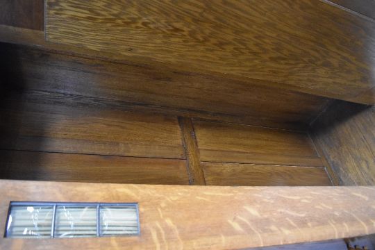 An early 20th century Arts & Crafts oak single wardrobe, in the manner of Shapland & Petter, Barnstable, having a moulded cornice with shaped decorative brackets over a plain frieze centred by a moulded roundal, with bevelled mirror door below flanked by material backed leaded glass panels, on bracket feet 200cm x 83cm x 50cm cornice unattached at present and requires some attention