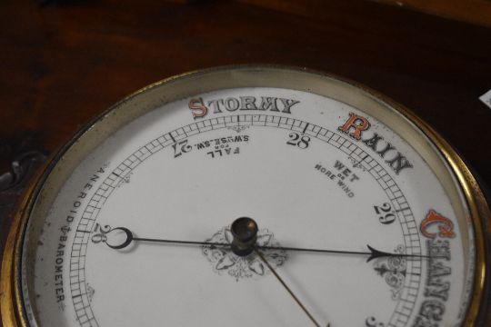 A late Victorian carved mahogany aneroid wheel barometer, of traditional design 85cm sold along with a 20th century Comitti, London barometer 83cm
