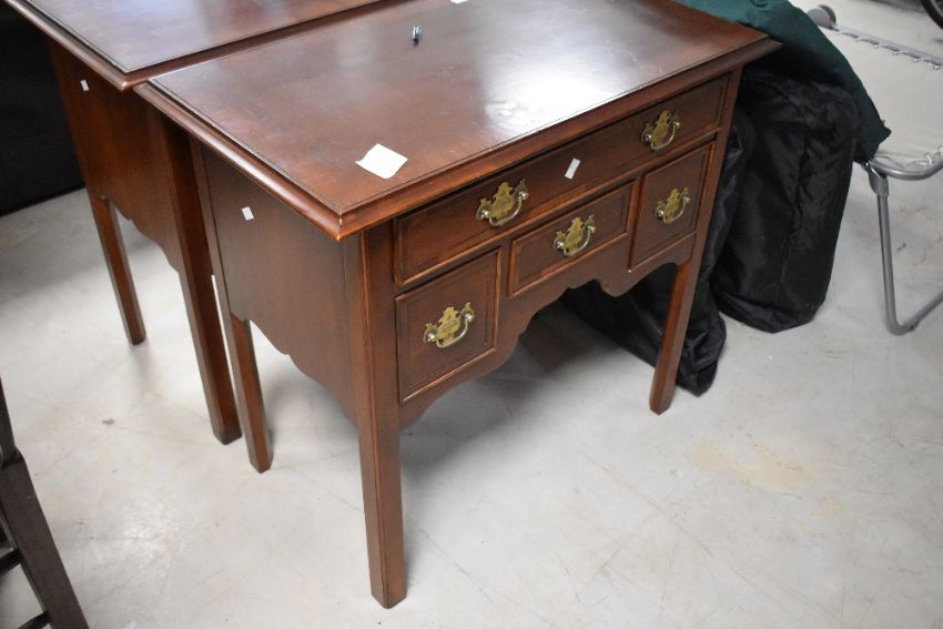 A reproduction mahogany lowboy, the moulded and banded rectangular top above an arrangement of long, short and deep drawers, each with shaped brass back plates and bale type handles, raised on moulded square section legs, 79cmx 83cm x 49cm