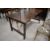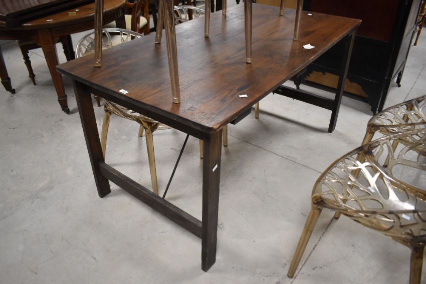 A vintage oak village hall style trestle table, of rectangular form, with hinged supports with metal pole fasteners 77cm x 152cm x 83cm