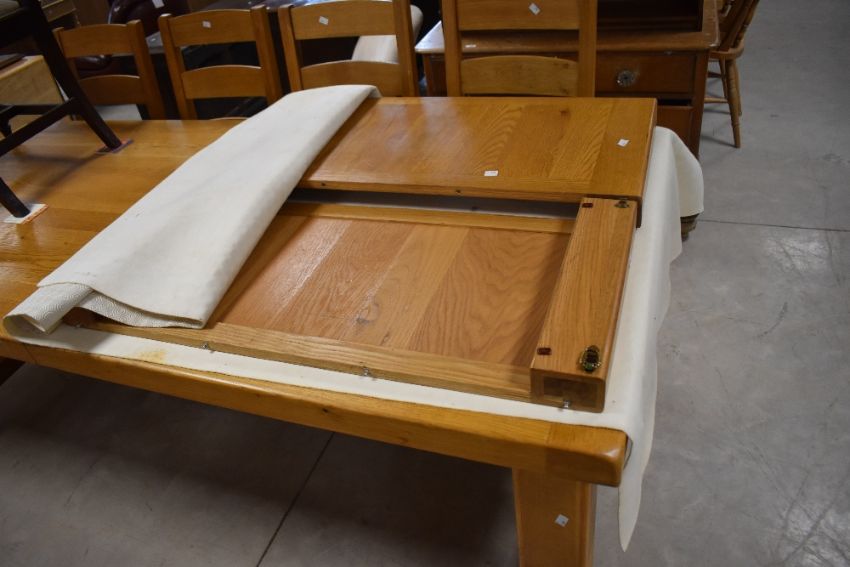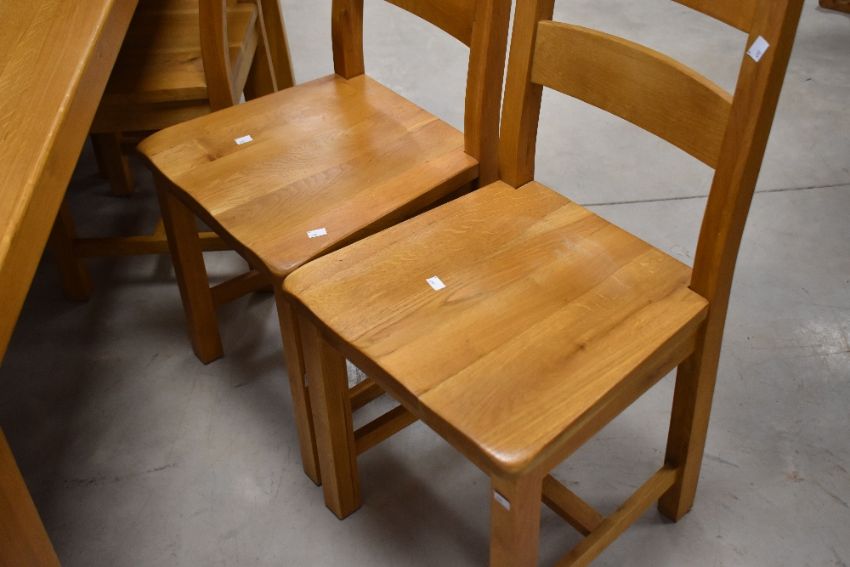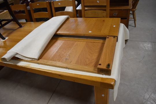 A large modern light oak extending farmhouse style refectory dining table and eight ladder-back dining chairs, the rectangular draw-out top with two additional leaves raised on substantial legs linked by a H-form stretcher 79cm x 220cm x 100cm (closed) leaves 45cm, the chairs with three broad horizontal rails between square section uprights, the dished seat on conforming supports, seat height 48cm, 108cm overall