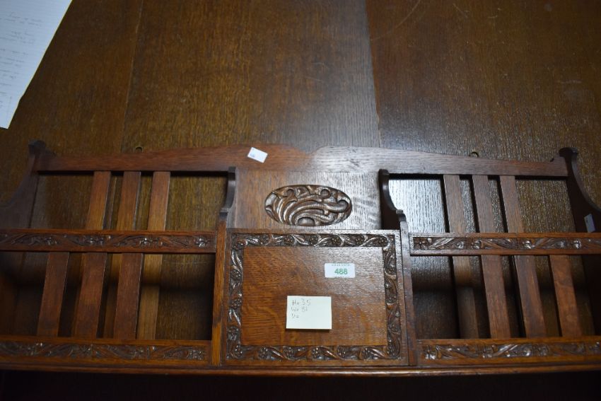 Local interest* Ernest John Oldcorn, an Arts & Crafts oak wall rack, the shaped back over the central section finely carved oval motif and bordered facia, flanked by slatted divisions with conforming carved detail, between shaped ends 41xm x 83cm *Ernest John Oldcorn trained at Gillow of Lancaster and went on to work for Arthur W Simpson at The Handicrafts, Kendal along with Hubert Simpson, Tom Dixon, Bill Phillipson and Tommy Parkin, he was one of two craftsmen who worked on the woodwork and carvings at Blackwell. As well as producing work from home in the family wash house. He later became foreman for Stanley Davies and carved the Famous Black Pig in Kendal