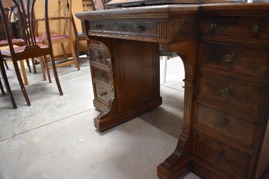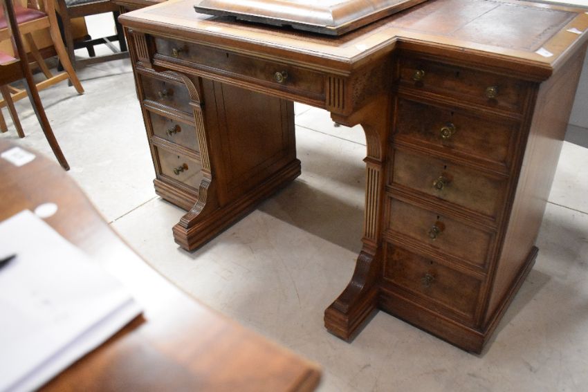 An attractive 19th century Gillows of Lancaster figured walnut break-front writing desk, the rectangular break-front top with red stained and tooled leather skiver over a central frieze drawer (stamped Gillows Lancaster) and knee hole section with shaped and reeded supports, flanked by five drawers to each side 73cm x 122cm x 57.5cm