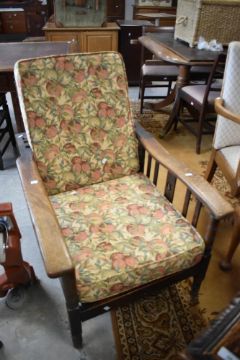 A vintage oak framed Parker Knoll style recliner armchair, with ratchet type action 71cm x 95cm x 70cm sold together with a shaped bed tray with turned supports