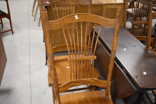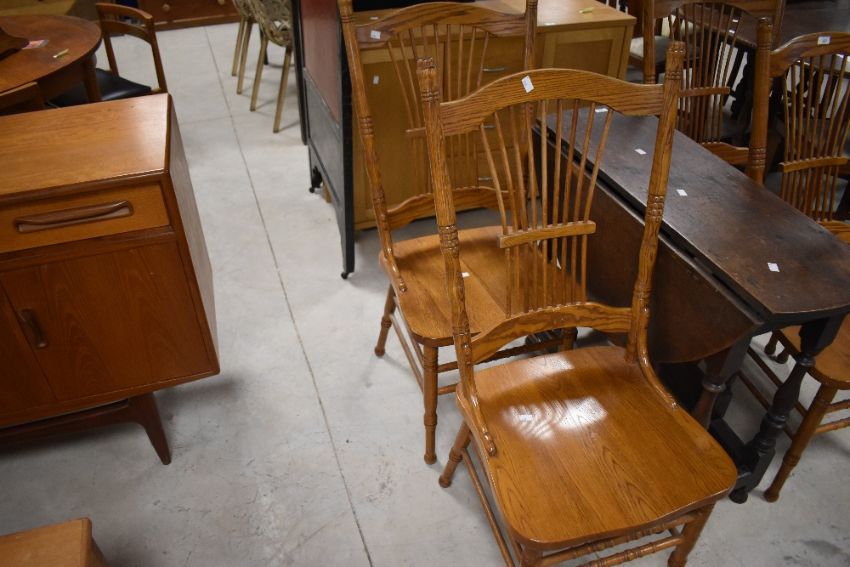 A set of four stained frame dining chairs in the colonial style having solid seats and spindle backs