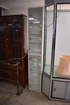A tall modern glass fronted lockable and illuminated display unit, with two long glass doors enclosing adjustable glass shelves, 200.5cm