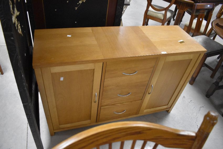 A modern light oak effect sideboard, the oblong top over three central drawers and flanked by cupboard drawers, the ends extending as feet 78cm x 120cm x 40cm
