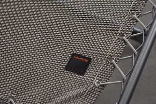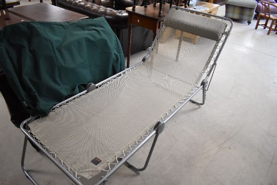 A group of three Lafuma folding sun loungers, each with canvas carrycase