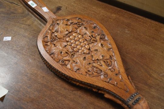 Local interest* Ernest John Oldcorn, a pair of fine Arts & Crafts oak long handled bellows, of elongated form and carved with fruiting foliage, bearing craftsmans signature and date 1924 to reverse. Some deterioration to leather otherwise good condition. *Ernest John Oldcorn trained at Gillow of Lancaster and went on to work for Arthur W Simpson at The Handicrafts, Kendal along with Hubert Simpson, Tom Dixon, Bill Phillipson and Tommy Parkin, he was one of two craftsmen who worked on the woodwork and carvings at Blackwell. As well as producing work from home in the family wash house. He later became foreman for Stanley Davies and carved the Famous Black Pig in Kendal