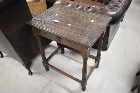 An early 20th century oak occasional table, of rectangular form, the top carved with a central shield with crossed flags, with date 1902 above and within a diaper and roundal border, all raised on block and turned supports, 72cm x 64cm x 46cm some joint separation.