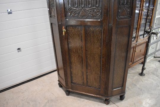 An early 20th century reproduction linen-fold oak hall robe, of canted rectangular form the shaped open canopy with carved and detail on carved cup and cover supports over the triple panelled door with carved linen fold design, flanked by conforming canted sides on turned feet 206cm x 108cm x 46cm