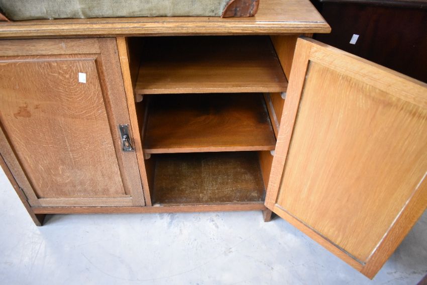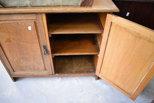 A 20th century oak two-door cabinet, having a shallow raised back and moulded rectangular top above two fielded panel doors enclosing internal shelving, the ends extending as feet, 84cm x 92cm x 50cm