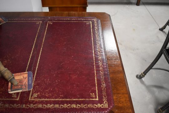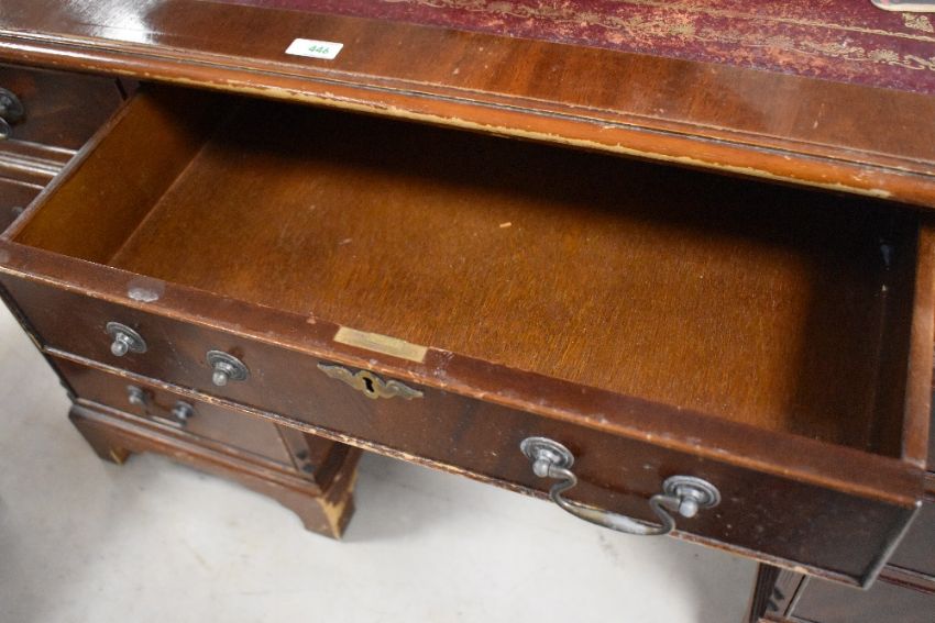A reproduction mahogany pedestal knee-hole desk, the moulded rectangular top with inset red-stained and gilt tooled leather skiver, over three frieze drawers and supporting pedestals, each with three drawers, on bracket feet 79cm x 38cm x 76cm
