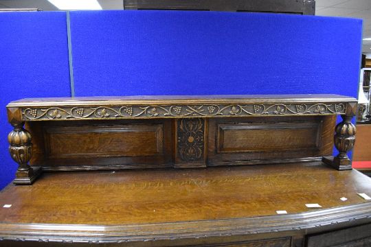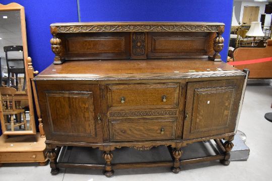 A large reproduction carved oak sideboard, having a raised, panelled and carved back with cup and cover supports over the moulded and shaped rectangular top with two central drawers and flanking cupboard doors below, raised on conforming supports linked by moulded stretchers 1142cm x 184cm x 56cm one drawer with missing handle