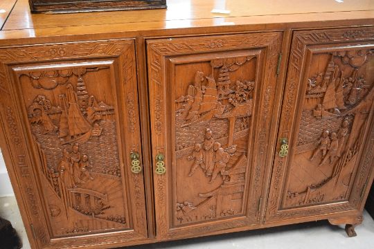 A Chinese carved hardwoodsideboard, having typical carved chinoiserie decoration, dimensions approx. W122 D45.5 H91.5cm