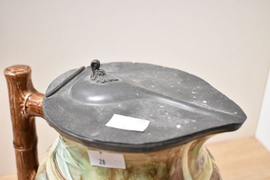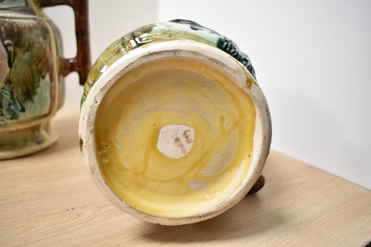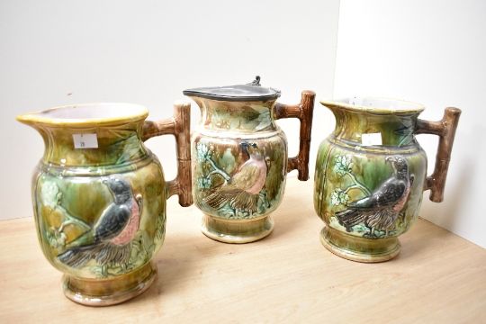 Three large presumed 19th-century Thomas Forester-style majolica pitchers, featuring molded bird motifs and bamboo-formed handles, one example features a pewter hinged lid, all unmarked, (3), condition is consistent with age and use, no visible chips, cracks or fixed damage, visible areas of surface wear to all.